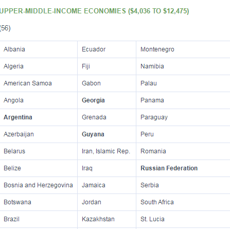 Իսկ Հայաստանի հարևան Վրաստանն ու Ադրբեջանը գտնվում են միջին մակարդակից բարձր երկրներ ունեցող երկրների ցանկում (Upper-Middle-Income Economies ($4,036 - $12,475)): Այդ ցանկում են նաև Ռուսաստանը, Թուրքիան, Արգենտինան, Իրանը: Որքան զարմանալի չթվա, անգամ Վենեսուելան է այս ցանկում, որը վերջին տարիներին գտնվում է լուրջ քաղաքական ու տնտեսական ճգնաժամի մեջ: