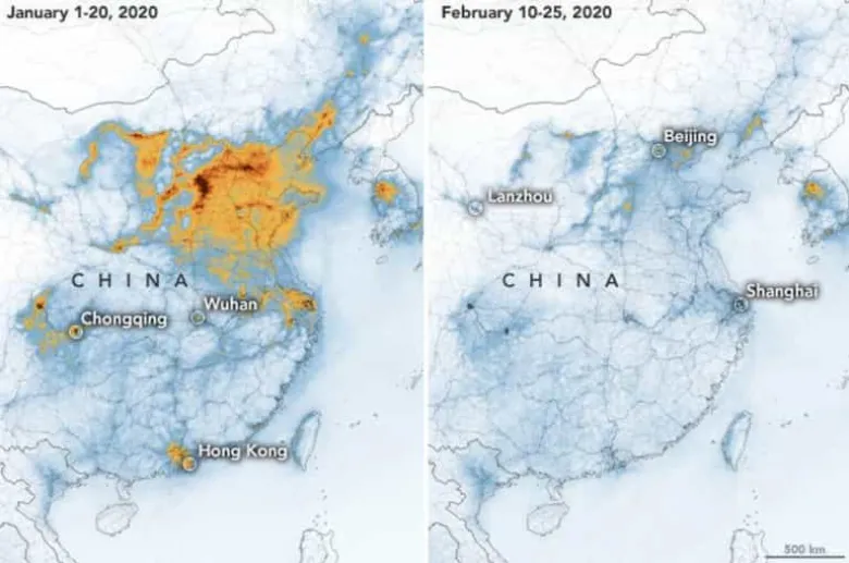 Լուսանկարներից պարզ է դառնում, որ համաճարկի պատճառով չինացիների՝ տանը փակվելու և գործարանների չաշխատելու արդյունքում օդի աղտոտվածության մակարդակը զգալի նվազել է: