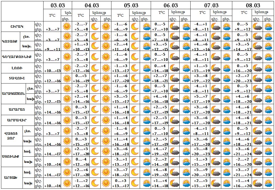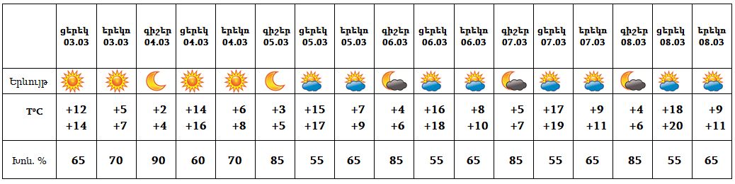 Օդի ջերմաստիճանը մարտի 3-ի ցերեկը, 4-8-ն աստիճանաբար կբարձրանա 5-7 աստիճանով:
