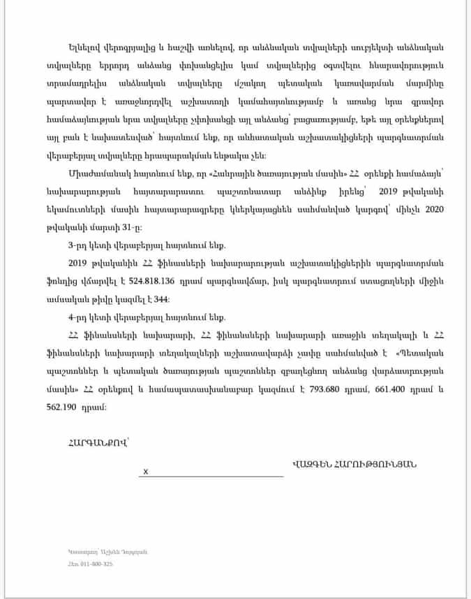 Մեր այն բացատրությանը, որ ՀՀ ֆինանսների նախարարը չի կարող համարվել աշխատող, ում կողմից պետական բյուջեից ստացած պարգևավճարների չափը կարող է համարվել անձնական տվյալ և գաղտնի պահվել, նախարարությունից պատասխանեցին, որ ավել տեղեկատվություն չեն կարող տրամադրել այս պահին, պետք է սպասել հայտարարագրին։