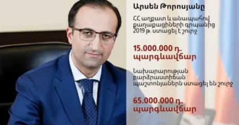 Արսեն Թորոսյանն անցած տարվա ընթացքում պետական բյուջեից ստացել է 15.000.000 դրամ (շուրջ 30.000$) պարգևավճար: Իր կողմից կատարվող թալանը հիմնավորելու և մյուս աշխատակիցների ձայները կտրելու համար էլ Թորոսյանը 65.000.000 (շուրջ 130.000$) է հատկացրել նախարարության բարձրաստիճան պաշտոնյաներին: Սա այն դեպքում, երբ Հայաստանում աղքատությունը բնակչության գրեթե կեսի դռներին չոքած է, այն դեպքում, երբ բազմաթիվ ընտանիքներ այս օրերին սկսում են տարրական պարենային խնդիրների առաջ կանգնել: Արսեն Թորոսյանը լավ հայր է իր երեխաների համար, քանի որ նրանց լավ է պահում, բայց նա այդ ամենն անում է այլ երեխաներից բացահայտ թալանելով: