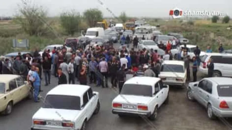 Արդեն 2 ժամ է, լարված ու պայթյունավտանգ իրավիճակ է ստեղծվել Արմավիրի մարզի մի քանի գյուղերում։ Վաղարշապատ-Աշտարակ ավտոճանապարհի Մրգաստան գյուղի խաչմերուկում՝ ի նշան բողոքի, բնակիչները փակել են ճանապարհը եւ հայտարարում են, որ այն չեն բացի։
