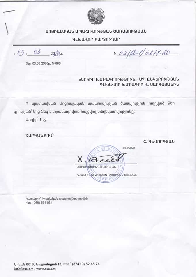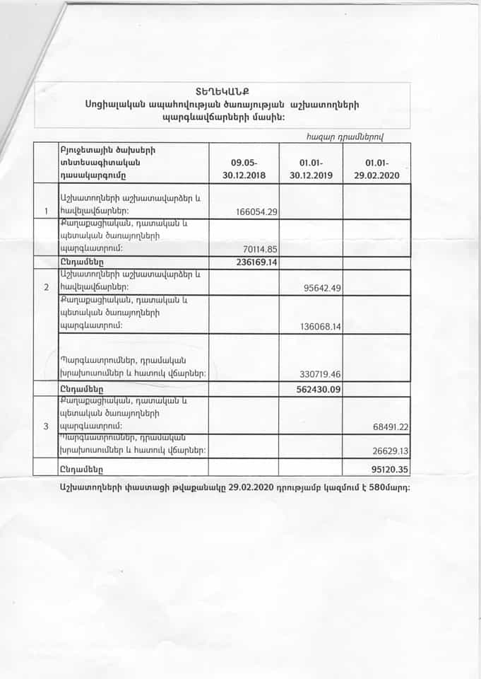Ստացված գրավոր պատասխանում (կցվում է) նշված է, որ ՀՀ սոցիալական ապահովության ծառայության աշխատակիցներին տրամադրված պարգևավճարները 2018 թ. 8 ամիսներին կազմել է 236169.14 հազ. դրամ, 2019 թ.՝ 562430.09 հազ. դրամ, 2020 թ. առաջին երկու ամիսներին՝ 95120.35 հազ. դրամ: