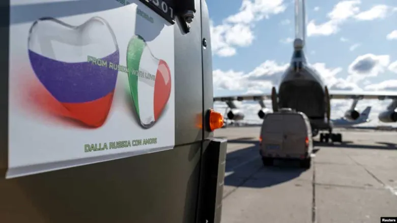Նախագահ Վլադիմիր Պուտինի և վարչապետ Ջուզեպե Կոնտեի միջև հեռախոսազրույցից հետո մարտի վերջին Ռուսաստանի բանակի վարակաբան-բժիշկների, բուժքույրերի և ախտահանողների թիմերը անհրաժեշտ սարքավորումներով բեռնված օդանավով մեկնել են Իտալիա, որտեղ ախտահանել են մի շարք ծերանոցներ, հիվանդանոցներ և այլ հիմնարկներ ու բուժօգնություն են տրամադրել բնակիչներին: