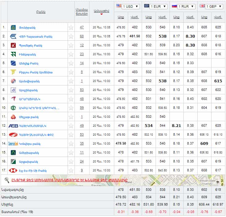 Ներկայացնում ենք Հայաստանի բանկերի կողմից գնվող և վաճառվող արտարժույթների փոխարժեքները հունիսի 20-ի դրությամբ՝ ըստ rate.am-ի: