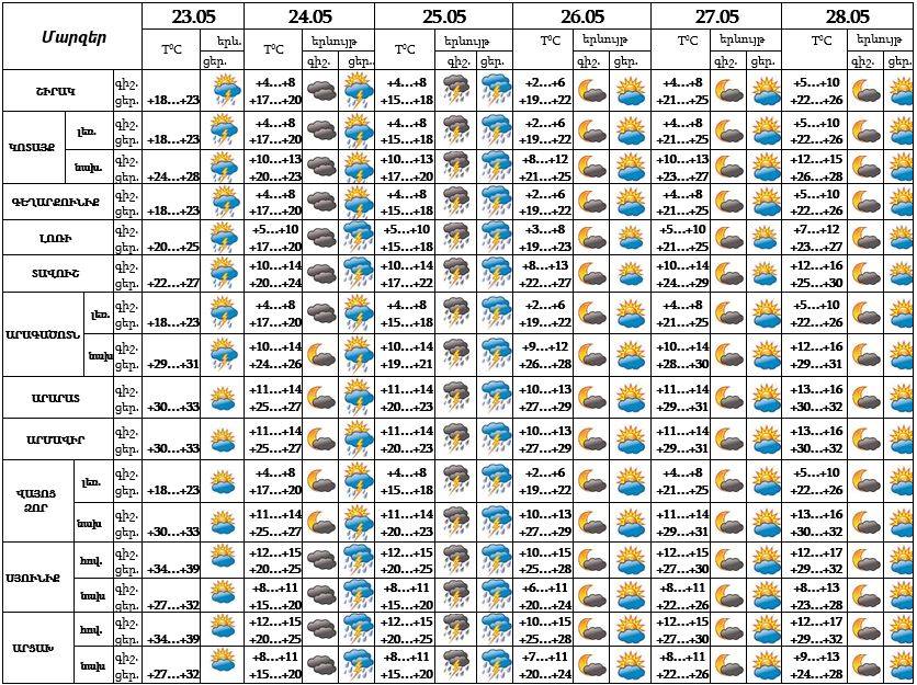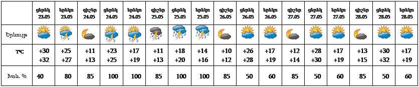 Երևան քաղաքում՝ մայիսի 23-ին քաղաքի առանձին հատվածներում սպասվում է կարճատև անձրև և ամպրոպ։ Մայիսի 24-25-ը սպասվում է անձրև և ամպրոպ։ Մայիսի 26-28-ը սպասվում է առանց տեղումների եղանակ: Ամպրոպների ժամանակ սպասվում է քամու ուժգնացում՝ 20-22 մ/վ։