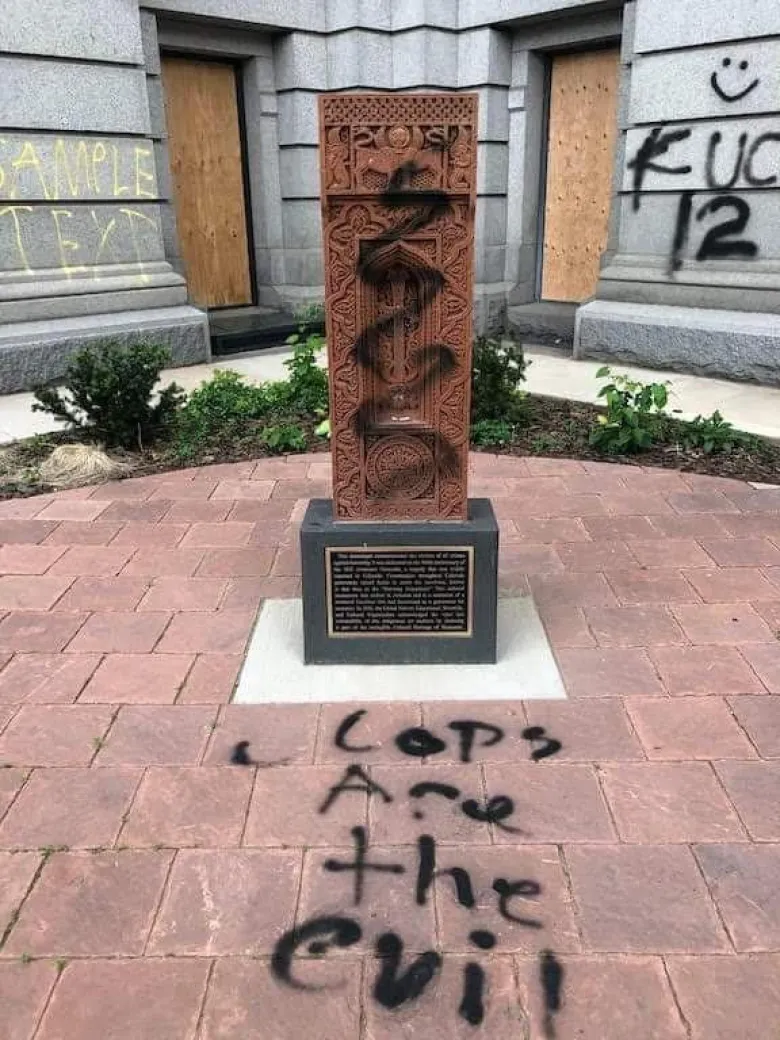 «ԱՄՆ-ում շարունակվող անկարգությունների ընթացքում պղծվել է Դենվերում գտնվող հայկական խաչքարը: Այն տեղադրվել էր Հայաստանի երտասարդական հիմնադրամի և տեղի հայ համայնքի ջանքերով 2014թ»,- գրել է նա: