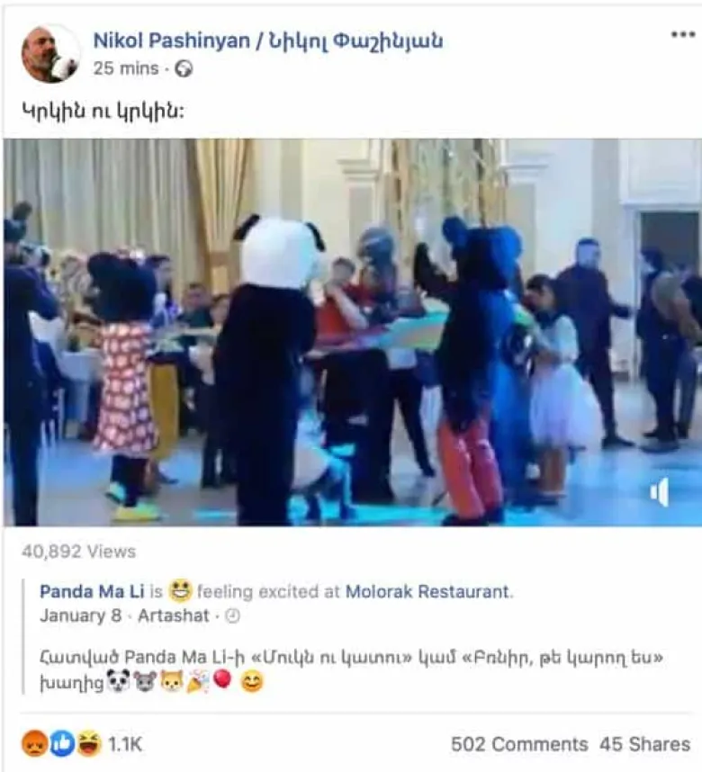 Վարչապետը կիսվել էր «Պանդա Մա Լի» կազմակերպության ֆեյսբուքյան էջում տեղադրված տեսանյութով, որի հրապարակման ամսաթիվը ցույց էր տալիս հունվարի 8։