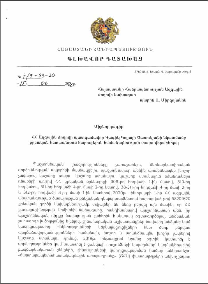 Գլխավոր դատախազ Արթուր Դավթյանն այսօր՝ հունիսի 16-ին, Ազգային ժողովում ներկայացրեց ԱԺ պատգամավոր Գագիկ Կոլյայի Ծառուկյանի նկատմամբ քրեական հետապնդում հարուցելուն համաձայնություն տալու վերաբերյալ և ՀՀ Ազգային ժողովի պատգամավոր Գագիկ Կոլյայի Ծառուկյանին ազատությունից զրկելուն համաձայնություն տալու վերաբերյալ միջնորդագրերը։