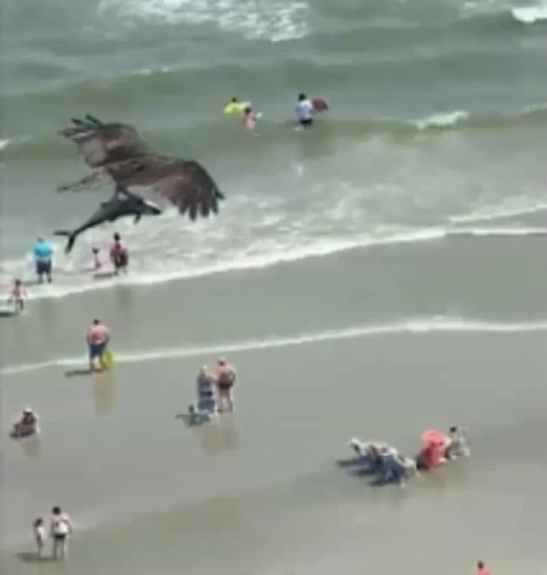 ԱՄՆ Հարավային Կարոլինա նահանգի Միրթլ Բիչ քաղաքի լողափում հանգստացողներն ապշեցուցիչ տեսարանի են ականատես եղել, երբ հսկայական թռչունը շնաձկան նմանվող մեծ ձկանը ճանկերով բռնած թռել է հանգստյան գոտու վրայով, գրում է Daily Mail պարբերականը։