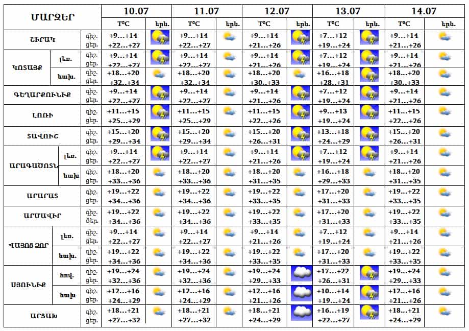 Հուլիսի 10-ին հյուսիսային, 12-13-ը արևելյան շրջաններում երեկոյան ժամերին սպասվում է կարճատև անձրև և ամպրոպ, առանձին հատվածներում հնարավոր է կարկուտ։ Հուլիսի 11-ին, 14-ին սպասվում է առանց տեղումների եղանակ: