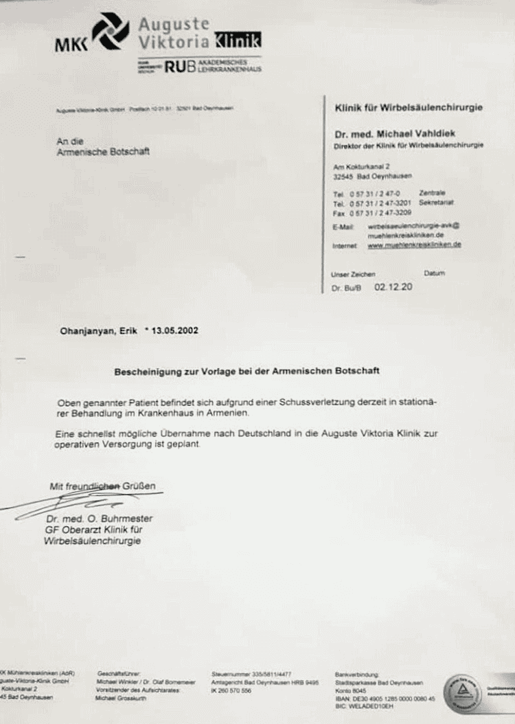 Հայաստանում այս պահին այդ վիրահատությունը չի կատարվում, այդ իսկ պատճառով կապ է հաստատվել Գերմանիայի հիվանդանոցներից մեկի` Auguste Viktoria Klinik հետ: Պատասխանը եկել է այսպես՝ որպեսզի էրիկը կարողանա նստել, հոգալ իր կարիքները, տեղաշարժվի սայլակով, անհրաժեշտ է հնարավորինս արագ իրականացնել ողնաշարի վերին հատվածի վիրահատություն։