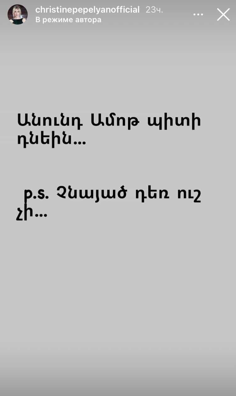 Երգչուհի Քրիստինե Պեպելյանն ինսթագրամի սթորի բաժնում գրառում է արել.