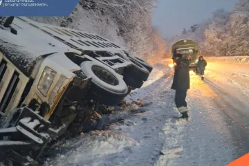 Դիլիջանի ոլորանում Man Van-ը ճանապարհի մաքրման աշխատանքներ իրականացնելիս կողաշրջ...