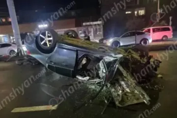 Աբովյանում «Infiniti»-ն բախվել է գովազդային երկաթե սյանն ու գլխիվայր շրջվել. կան...