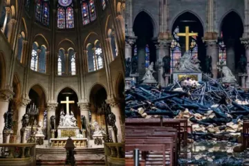 Փարիզի Աստվածամոր տաճարի նախկին վեհաշուք տեսքն ու այժմյան ավերված վիճակը՝ ֆոտոշա...