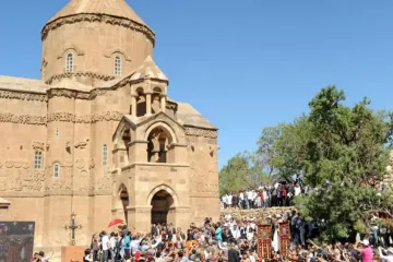 Վանի Աղթամար կղզու Սուրբ Խաչ եկեղեցում մատուցված պատարագին Հայաստանի դրոշ բռնած ...