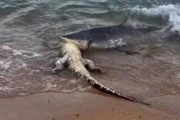 Կատաղի գոտեմարտ ծովափին. քաղցած շնաձուկը հոշոտում է հսկայական կոկորդիլոսին