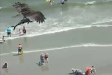 Հսկայական թռչունը, ճանկերով շնաձկան նմանվող ձուկ բռնած, թռել է լողափի վրայով (տե...