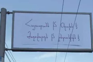 Որդիս, Արցախը Հայաստան է, և վերջ. Թբիլիսիում Հեյդար Ալիևի կիսանդրու վրա կախվել է եռալեզու վահանակ