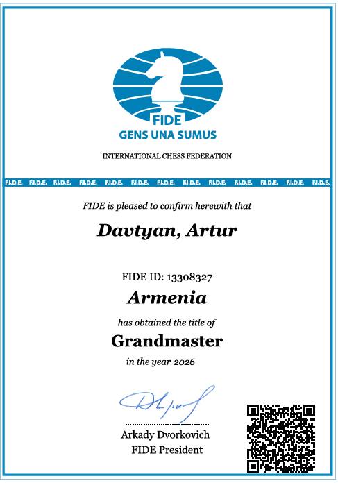 ՖԻԴԵ-ն Արթուր Դավթյանին շնորհել է գրոսմայստերի կոչում
