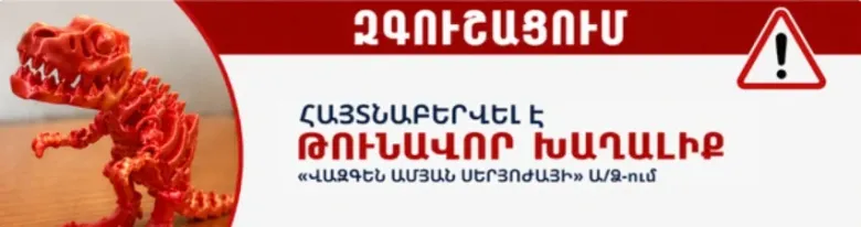 «Իրականացվել է խաղալիքի նմուշառում, որի արդյունքում պարզվել է, որ «Դինոզավր» անվանմամբ վաճառվող խաղալիքի բաղադրության մեջ առկա են երեխաների առողջության համար վտանգավոր (թունավոր) նյութեր։