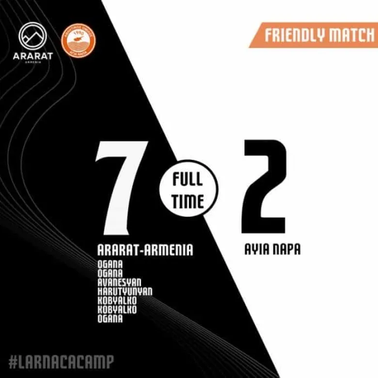 Կիպրոսում մարզումային հավաք անցկացնող ֆուտբոլի Հայաստանի չեմպիոն Երեւանի «Արարատ-Արմենիան» ստուգողական խաղում մրցել է Կիպրոսի «Այիա Նապայի» հետ։ Վարդան Մինասյանի գլխավորած թիմն առավելության է հասել 7։2 հաշվով։