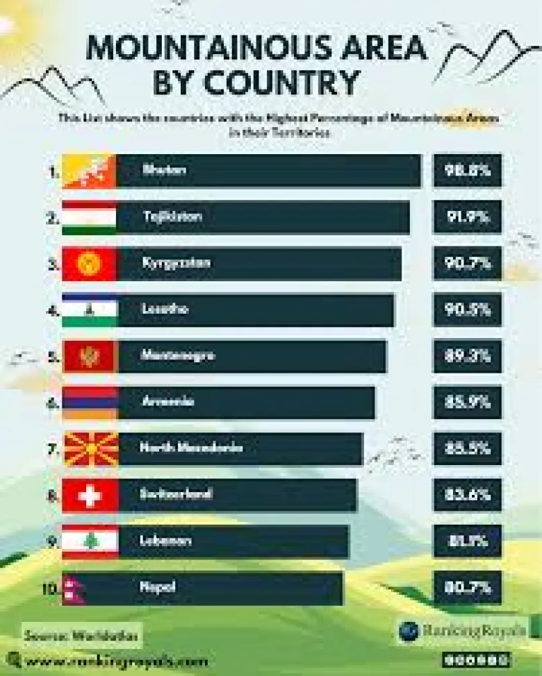 Առաջին տեղը զբաղեցնում է Բութանը, որտեղ տարածքի 98,8%-ը լեռնային է։