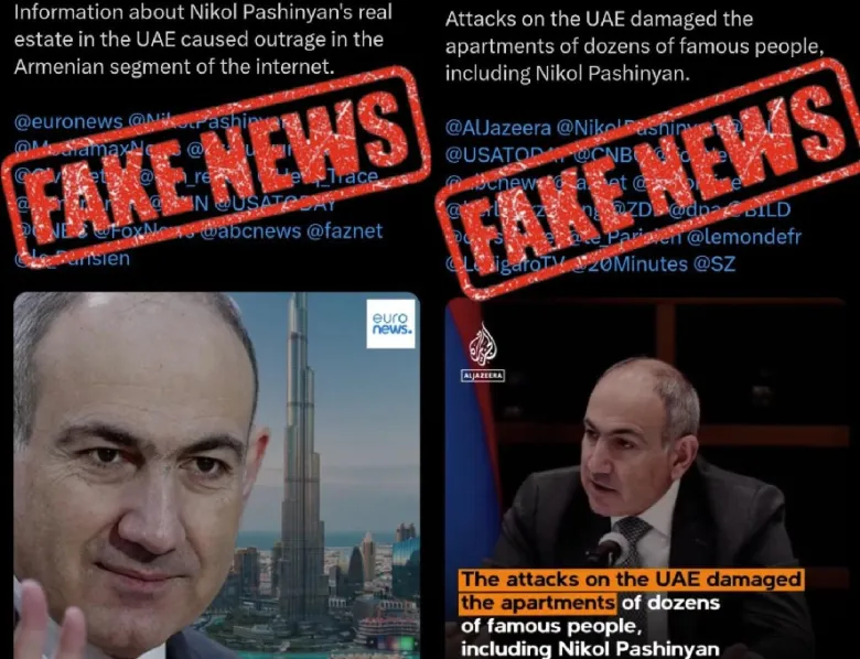 «Նախորդող օրերի ընթացքում X հարթակում կասկածելի օգտատերերի կողմից տարածվում են տեսանյութեր, որոնք իբրև թե հղում են անում «Al Jazeera»-ին և «Euronews»-ին՝ պնդելով, թե ԱՄԷ-ում՝ Դուբայում հրթիռակոծության հետևանքով վնասվել է ՀՀ վարչապետ Նիկոլ Փաշինյանին պատկանող անշարժ գույքը։