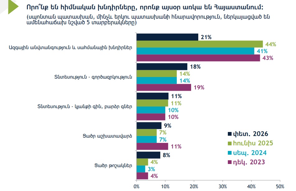 ՄՀԻ-ն այս հարցի համատեքստում ներկայացրել է վերջին 4 տարիների հետազոտության տվյալների համեմատությունը: Ըստ այդմ՝ հարցվածների 43 տոկոսը 2023-ի դեկտեմբերին որպես հիմնական խնդիր նշել է ազգային անվտանգությունն ու սահմանային հարցերը, 2024 թվականի սեպտեմբերին սա որպես խնդիր է նշել հարցվածների 41 տոկոսը, 2025 թվականի հունիսին՝ 44 տոկոսը, իսկ 2026 թվականի փետրվարին ազգային անվտանգությունն ու սահմանային հարցերը որպես հիմնական խնդիր նշողների տոկոսը կրկնակի նվազել է՝ դառնալով 21 տոկոս: