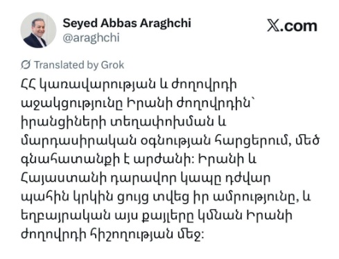 Իրանի արտաքին գործերի նախարար Աբաս Արաղչին X-ի իր միկրոբլոգում ՀՀ կառավարությանը և ժողովրդին հայերենով շնորհակալություն է հայտնել: