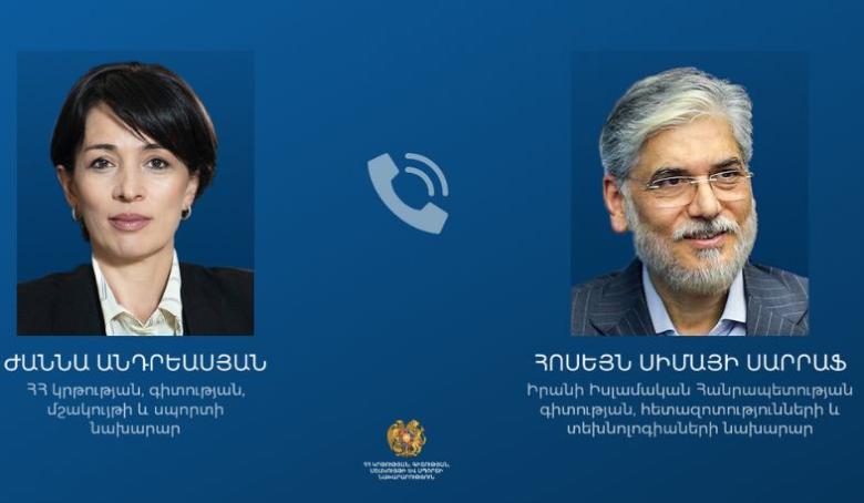 Armenia’s Minister of Education, Science, Culture and Sports Zhanna Andreasyan held a phone conversation today with Iran’s Minister of Science, Research and Technology Hossein Simaei Sarraf.