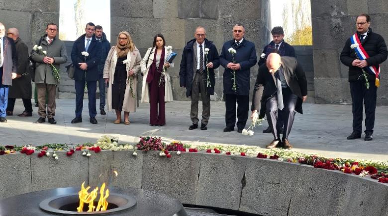 The Armenian Genocide Museum-Institute said in a press release that its acting director, Hrachya Tashchyan, welcomed and accompanied the dignitaries. Benjamin Haddad laid a wreath at the memorial. The delegation then laid flowers at the Eternal Flame and observed a moment of silence in memory of the victims of the Armenian Genocide.