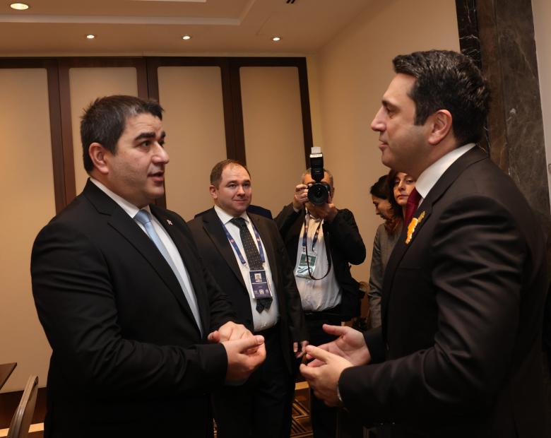 Speaker of the National Assembly of Armenia Alen Simonyan held a meeting with Speaker of the Parliament of Georgia Shalva Papuashvili on the sidelines of the plenary session of the 152nd Assembly of the Inter-Parliamentary Union (IPU).