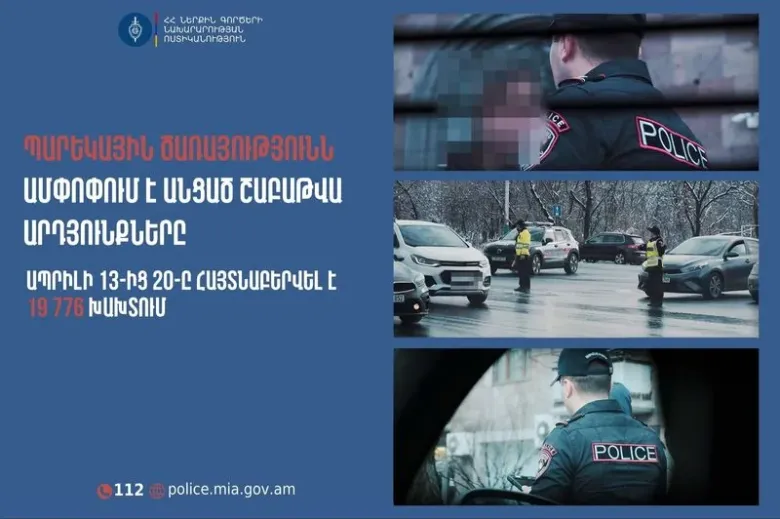 Ապրիլի 13-ից 20-ը մայրաքաղաքում իրականացված ծառայության ընթացքում Երևանի պարեկները հայտնաբերել են ճանապարհային երթևեկության կանոնների 4701 խախտում՝ պահպանվող հատուկ տարածք տեղափոխելով 165 ավտոմեքենա։ Մասնավորապես, հայտնաբերվել է ոչ սթափ 176 վարորդ, առանց վարորդական իրավունքի վկայականի՝ 114 անձ։