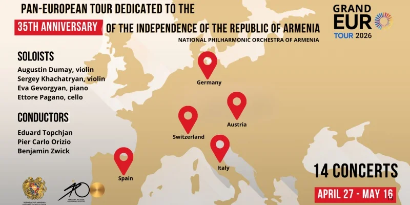 ՀՀ անկախության 35-ամյակի միջոցառումների շրջանակում ապրիլի 27-ից մայիսի 16-ը Հայաստանի ազգային ֆիլհարմոնիկ նվագախումբը 14 համերգով հանդես կգա Եվրոպայի հինգ մշակութային կենտրոններում: Շրջագայությունն իրականացվում է ԿԳՄՍ նախարարության աջակցությամբ և ընդգրկում է Իտալիայի, Գերմանիայի, Շվեյցարիայի, Ավստրիայի և Իսպանիայի հեղինակավոր համերգասրահները: