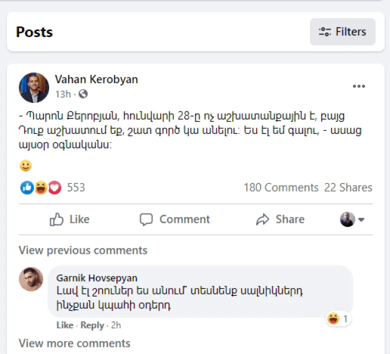Քաղաքացիները ֆեյսբուքյան գրառումներով ծաղրում են ՀՀ էկոնոմիկայի նախարար Վահան Քերոբյանի գրառումն, այն մասին, թե իր օգնականը հունվարի 28-ին, անկախ ոչ աշխատանքային լինելոց, որոշել է աշխատել նախարարի հետ այդ օրը: