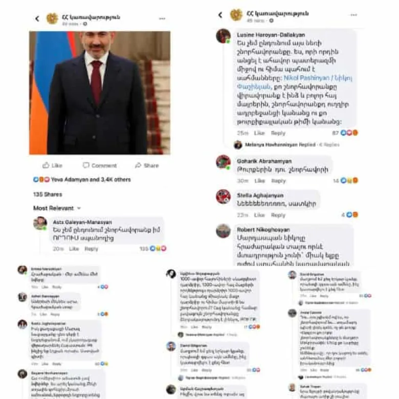 Կառավարության ֆեյսբուքյան էջում հայրուրավոր քաղաքացիներ անիծում ու հայհոյում են Նիկոլ Փաշինյանին՝ անվանելով «թուրք», «նեռ», «հայրենիք ծախող», մեղադրում են 1000֊ավոր հայուհիների սևազգեստ, 1000֊ավոր հայ մայրերի որդեկորույս դարձելու մեջ: