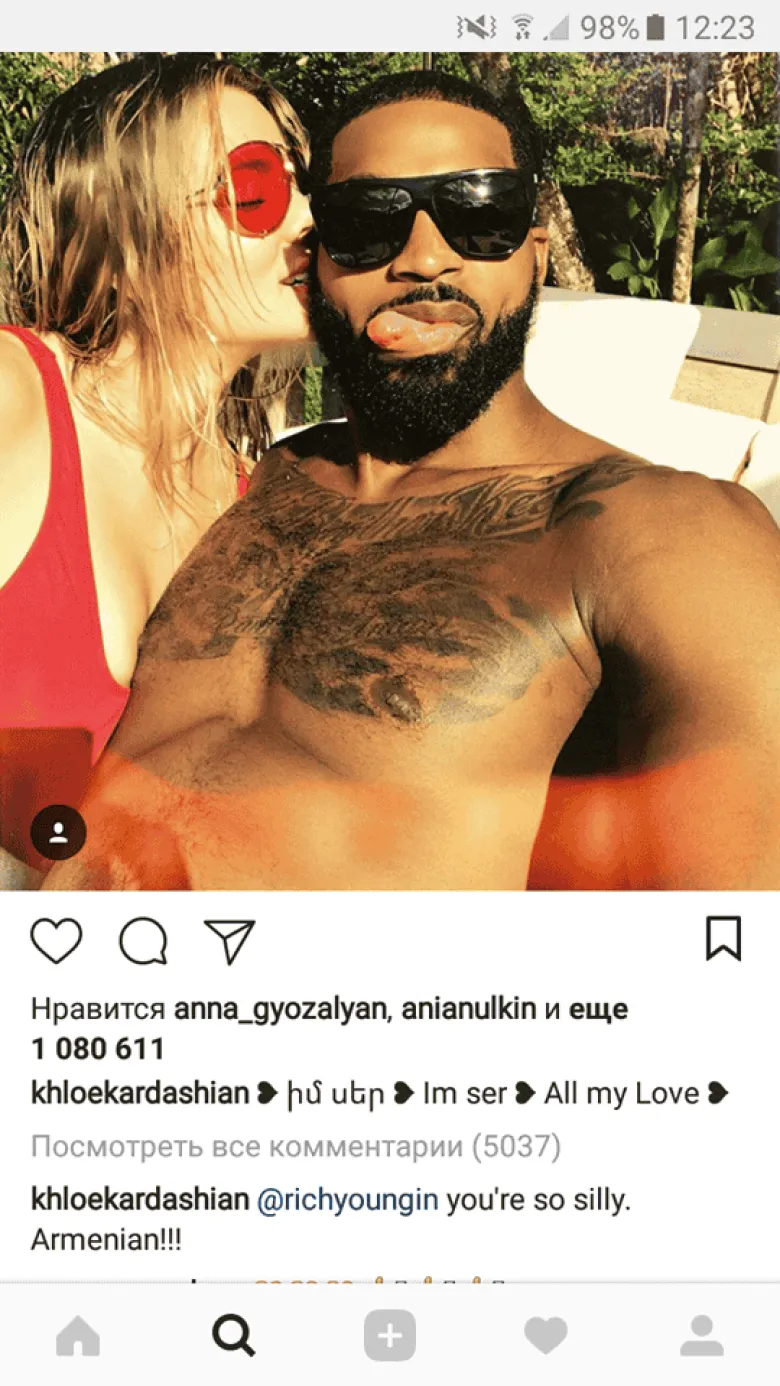 Քլոեն Instagram-ում Տրիստանի հետ լուսանկար է հրապարակել, որը մակագրել է հայերեն՝ «Իմ սեր», նույնը գրելով նաեւ անգլերեն: