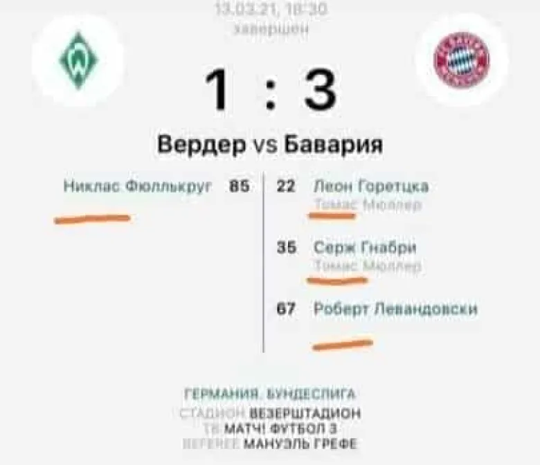 Երեկ ֆուտբոլի Գերմանիայի առաջնության Վերդեր-Բավարիա խաղում գրանցվեց 1:3 հաշիվը: Սիմվոլիզմով հետաքրքրվողներին հատկապես գրավել է գոլերի հեղինակների անունները: Վերդերից գոլը խփել է Նիկլաս անունով ֆուտբոլիստը, իսկ Բավարիայից՝ Լեւոնը, Սերժը եւ Ռոբերտը: