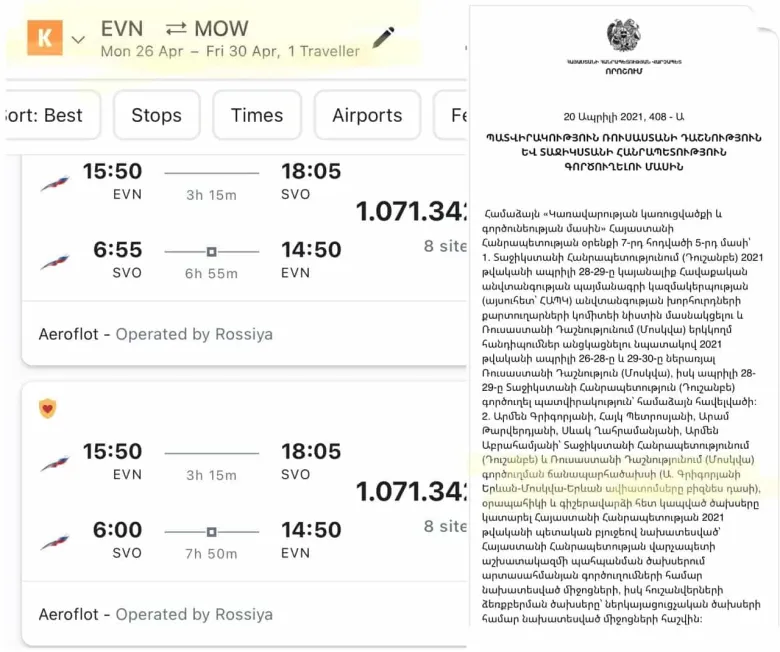 Mediaport-ը պարզեց, որ ապրիլի 26-30-ը Երևան-Մոսկվա-Երևան բիզնես դասի մեկ ավիատոմսի արժեքը 1 միլիոն 70 հազար դրամ է: Միչդեռ նույն ուղղությամբ սովորական ավիատոմսն արժե 250-300 հազար դրամ: