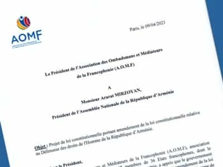 Ֆրանկոֆոն օմբուդսմանների և հաշտարարների ասոցիացիայի (ք. Փարիզ) նախագահ Մոհամեդ Բենալիլուն ասոցիացիայի բոլոր անդամների անունից բաց նամակ է հղել ՀՀ Ազգային ժողովի նախագահ Արարատ Միրզոյանին` առաջարկելով պահպանել Մարդու իրավունքների պաշտպանի ֆինանսական անկախության երաշխիքին առնչվող դրույթը: