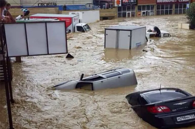 Սոչիում փողոցները վերածվել են գետերի, որոնցով հնարավոր է տեղաշարժվել միայն նավակով կամ լողալով: Ուժգին հոսանքը քշում-տանում է անգամ մեքենաները, գրում է life.ru-ն: