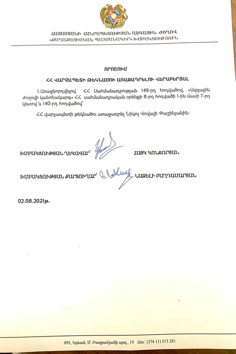 Էդգար Ղազարյանը ֆեյսբուքյան իր էջում գրում է․ «2021 թվականի օգոստոսի 2-ին հրապարակվել է ութերորդ գումարման Ազգային ժողովի «Քաղաքացիական պայմանագիր» խմբակցության որոշումը, որով վարչապետի պաշտոնում առաջադրվել ՝ Նիկոլ Փաշինյանի թեկնածությունը։ Ութերորդ գումարման Ազգային ժողովը իր լիազորությունները ստանձնել է 2021 թվականի օգոստոսի 2-ին ժամը 10․00-ից։
