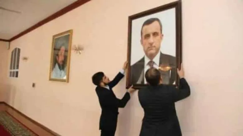 Լուսանկարում՝ Տաջիկստանում Աֆղանստանի դեսպանատանը Ահմադ Մասուդի լուսանկարի կողքին փակցնում են «Ազգային դիմադրության շարժման» մեկ այլ ղեկավարի՝ Ամրուլլահ Սալեհի լուսանկարը։