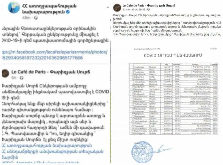 Փարիզյան Սուրճ ընկերությունն օրեր առաջ ֆեյսբուքյան էջում՝փաստաթղթեր էր հրապարակել՝ հայտնելով, որ ընկերության ամբողջ անձնակազմն ինքնակամ պատվաստվել է: