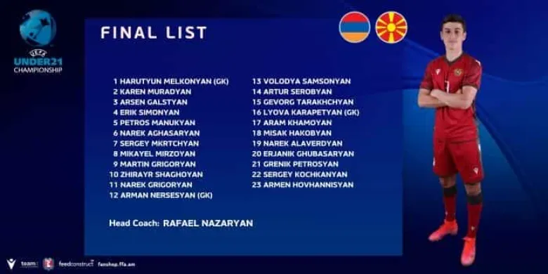 Ֆուտբոլի Եվրոպայի մինչեւ 21 տարեկանների առաջնության ընտրական մրցաշարում Հայաստանի թիմը հոկտեմբերի 12-ին Երեւանում կընդունի Հյուսիսային Մակեդոնիայի հասակակիցներին։ Գլխավոր մարզիչ Ռաֆայել Նազարյանը հրապարակել է թիմի մեկնարկային կազմը։
