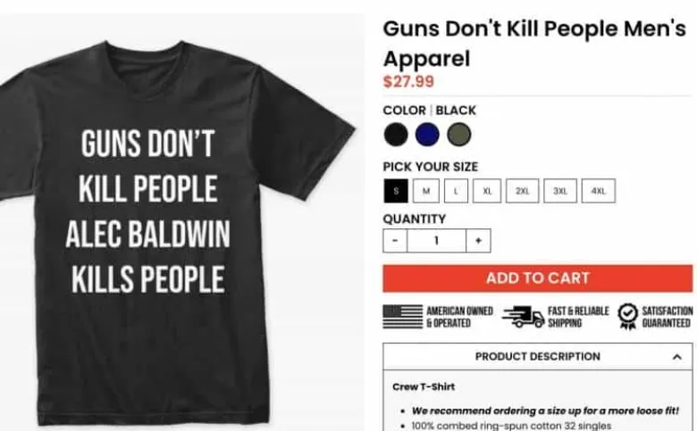 ԱՄՆ նախկին նախագահ Դոնալդ Թրամփի որդին սկսել է վաճառել «Զենքը չի սպանում մարդկանց, Ալեք Բոլդուինն է սպանում մարդկանց» մակագրությամբ կիսաթեւ շապիկներ։ Նշենք, որ դերասանի եւ Թրամփների ընտանիքի միջեւ թշնամանք կա՝ քաղաքական հայացքների տարբերության պատճառով, եւ դրա համար էլ կրտսեր Թրամփը որոշել է չարախնդալ եւ գումար վաստակել Բոլդուինի հետ տեղի ունեցածից։