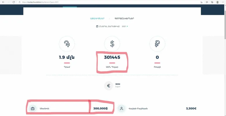 Հայաստանի վարչապետ Նիկոլ Փաշինյանի տիկնոջ՝ Աննա Հոկոբյանի կողմից ղեկավարվող «Իմ քայլը» հիմնադրամը, որը ստեղծվել է Նիկոլ Փաշինյանի վարչապետի պաշտոնում նշանակվելուց հետո, 2021 թվականին, որպես նվիրատվություն ստացել է 301․445 ԱՄՆ դոլար, որից 300․000 ԱՄն դոլարը (կամ ընդհանուրի 99,5%-ը) հատկացվել է մեկ անձի կողմից, այն էլ անանուն։ Այս մասին ֆեյսբուքյան իր էջում գրում է ՍԴ աշխատակազմի նախկին ղեկավար Էդգար Ղազարյանը: