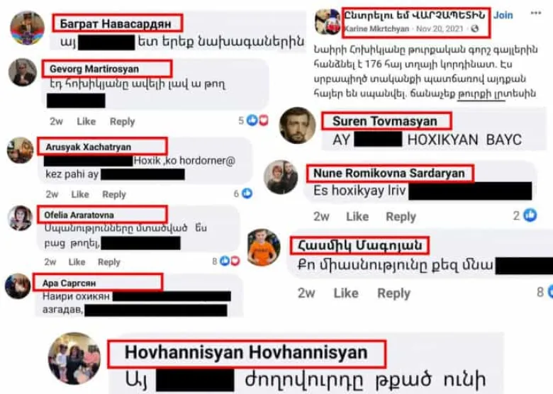 Եթե նկարում կարմիր շրջանակի մեջ եղած անունների մեջ կան ծանոթներ, ապա տեղեկացրեք, որ նրանց գտնվելու վայրը, տան հասցեն, բարեկամների ու ընտանիքների շրջանակը և այլ տվյալներ հստակ հայտնի են։ Շուտով քրեական գործեր և օրենքի շրջանակում խիստ պատիժներ նաև նրանց են հասնելու։ Կարող են նաև փախչել Հայաստանից, չի օգնելու, դրա լուծման ձևն էլ գիտենք։